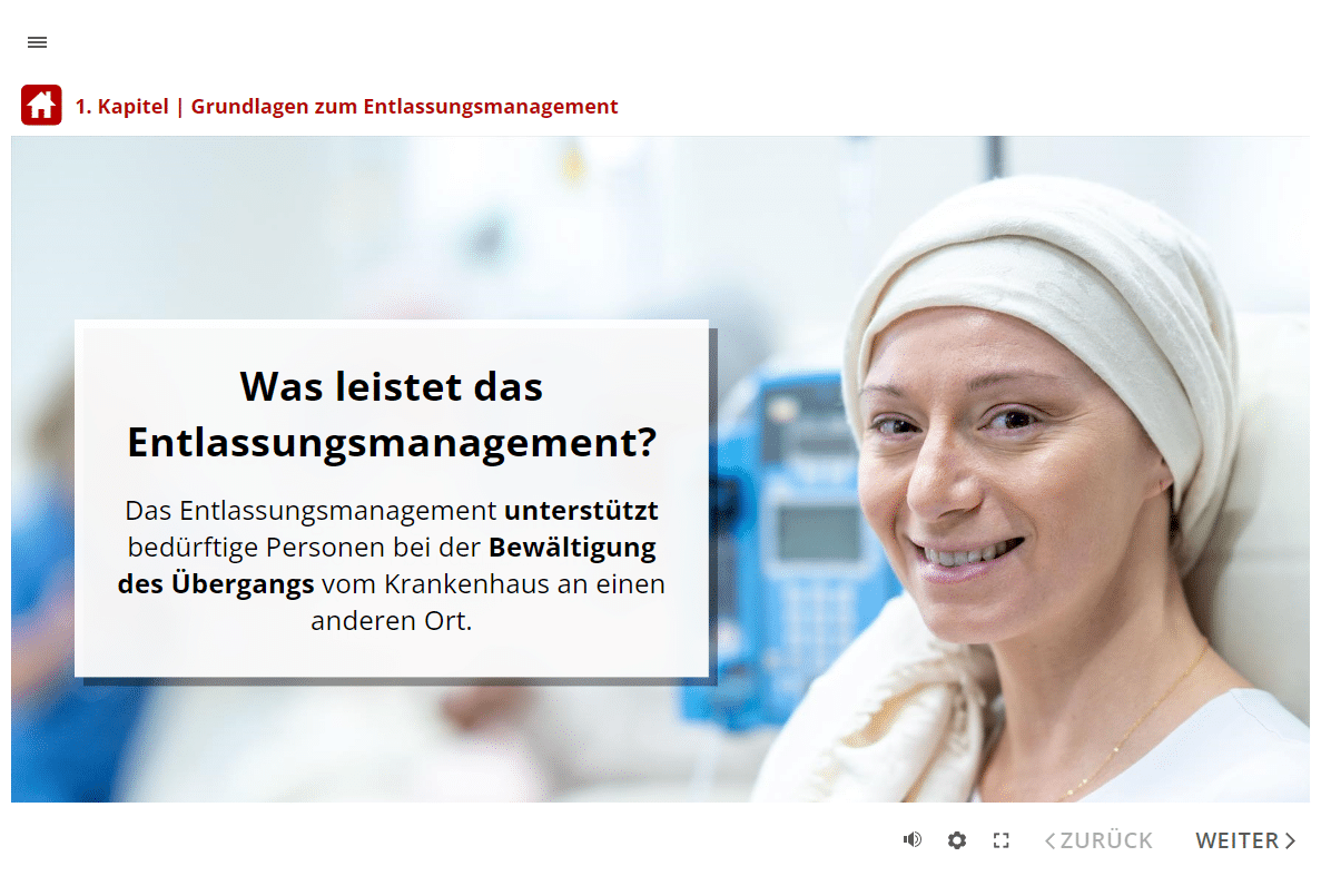 Lernziele: Nach dem Abschluss des Moduls können Sie die Funktion und die Ziele des Entlassungsmanagements beschreiben, die Schritte des Entlassungsmanagements erläutern, typische Aufgaben einer Entlassungsmanagerin oder eines Entlassungsmanagers benennen und zudem die Vorteile des Entlassungsmanagements aufzählen.