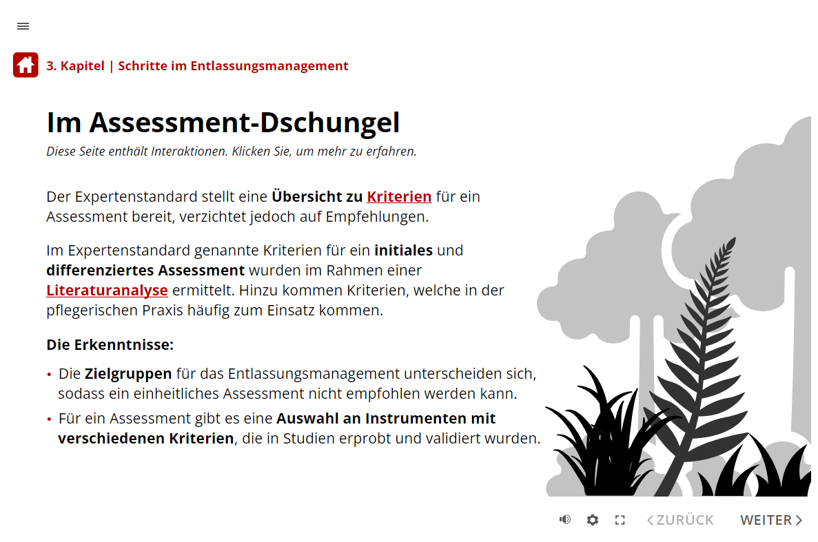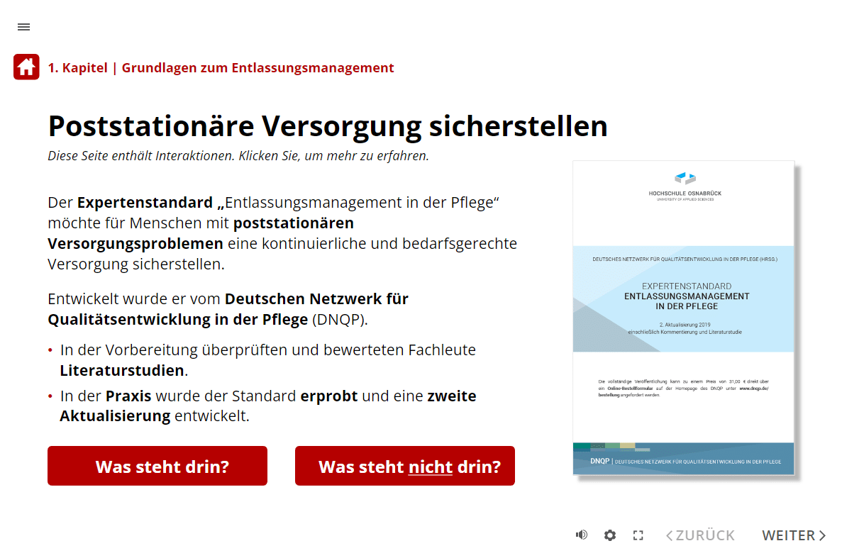 Das E-Learning-Modul gliedert sich in 3 Themenabschnitte. Sie erfahren etwa, welche Ziele der Expertenstandard verfolgt und welche Personen von einem systematischen Entlassungsmanagement profitieren. Das Modul erläutert auch, wie ein funktionierendes Entlassungsmanagement aufgebaut sein kann, welche Kompetenzen Pflegende dafür mitbringen sollten und welche Effekte das Entlassungsmanagement für eine Gesundheitseinrichtung haben kann. Das Modul endet mit einem Abschlusstest.