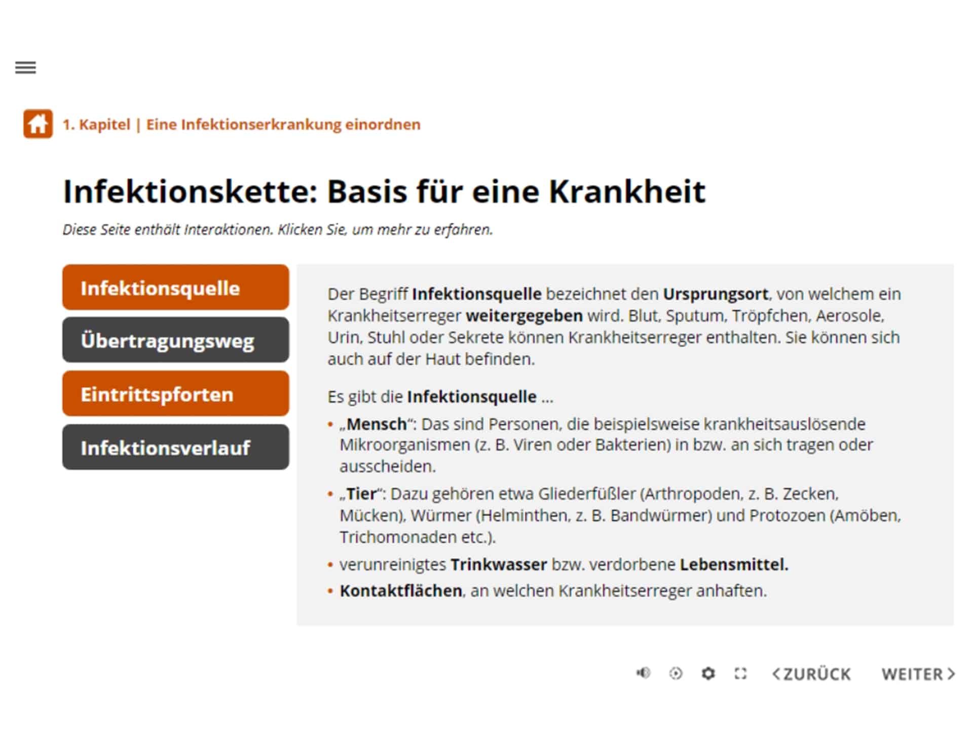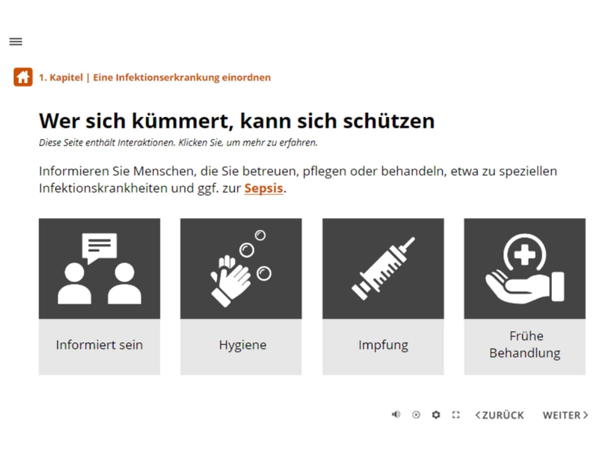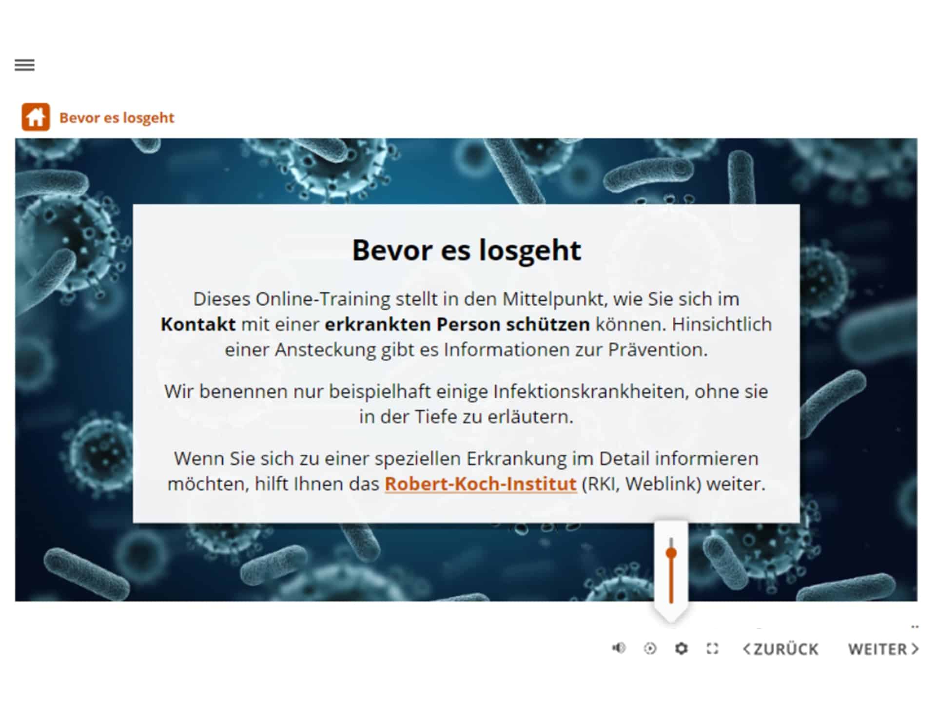 Das E-Learning-Modul gliedert sich in drei Kapitel. Sie lernen die Grundlagen zu unterschiedlichen Infektionskrankheiten kennen. Das Online-Training geht dann auf Verhaltensweisen ein, die im Alltag vor einer Krankheit schützen. Es erklärt, was unter Basishygiene zu verstehen ist und stellt Maßnahmen wie das Händewaschen und weitere Schutzmaßnahmen genauer vor.