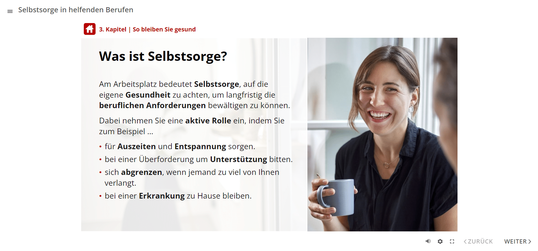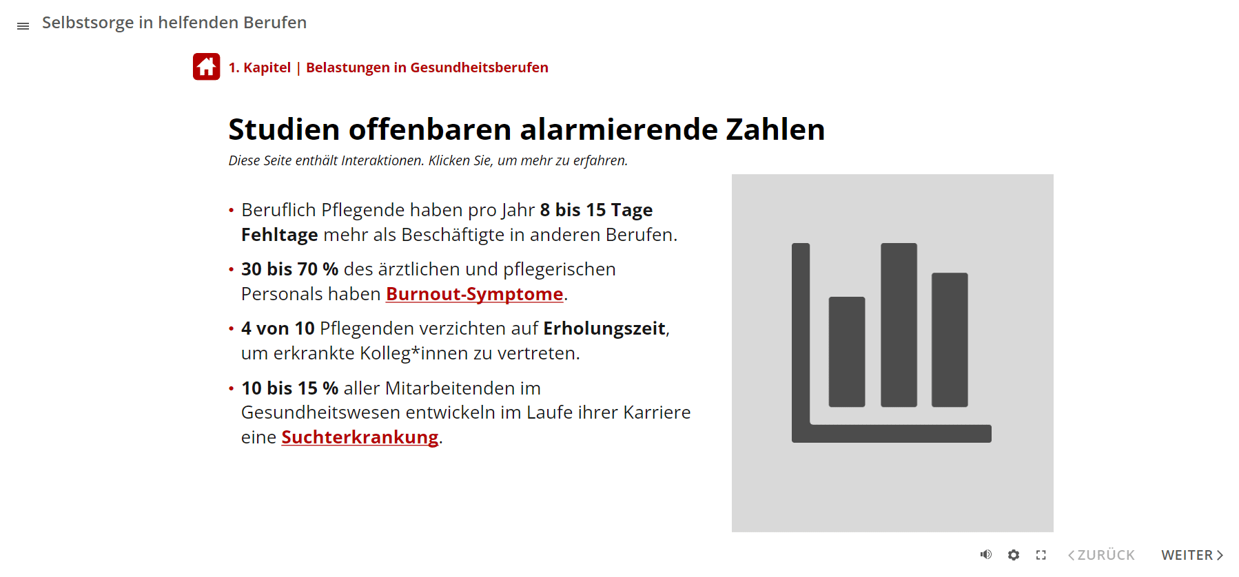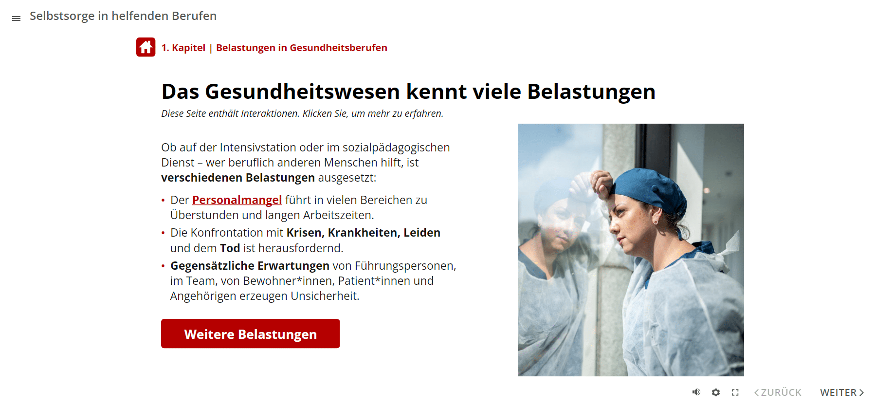 Das E-Learning-Modul gliedert sich in 4 Themenbereiche. Sie erfahren zunächst, welche Belastungsfaktoren es in Gesundheitsberufen gibt. Anschließend lernen Sie die Folgen dauerhafter Überlastungen kennen. Das Online-Training vermittelt zudem, wie Angestellte und Führungspersonen trotz Belastungen gesund bleiben können. Dies beinhaltet auch Aspekte der Suchtprävention. Im letzten Abschnitt geht es um die Frage, mit welchen Verhaltensweisen Sie den täglichen Belastungen als Team begegnen können.