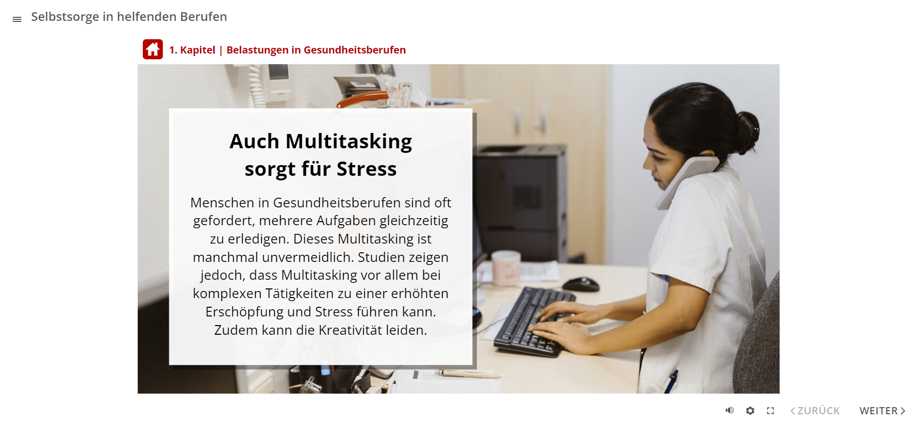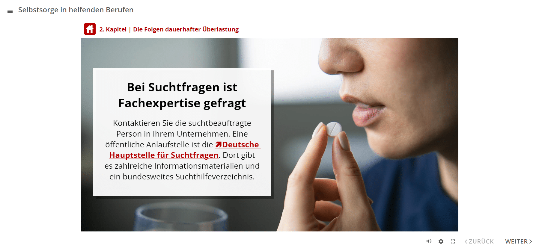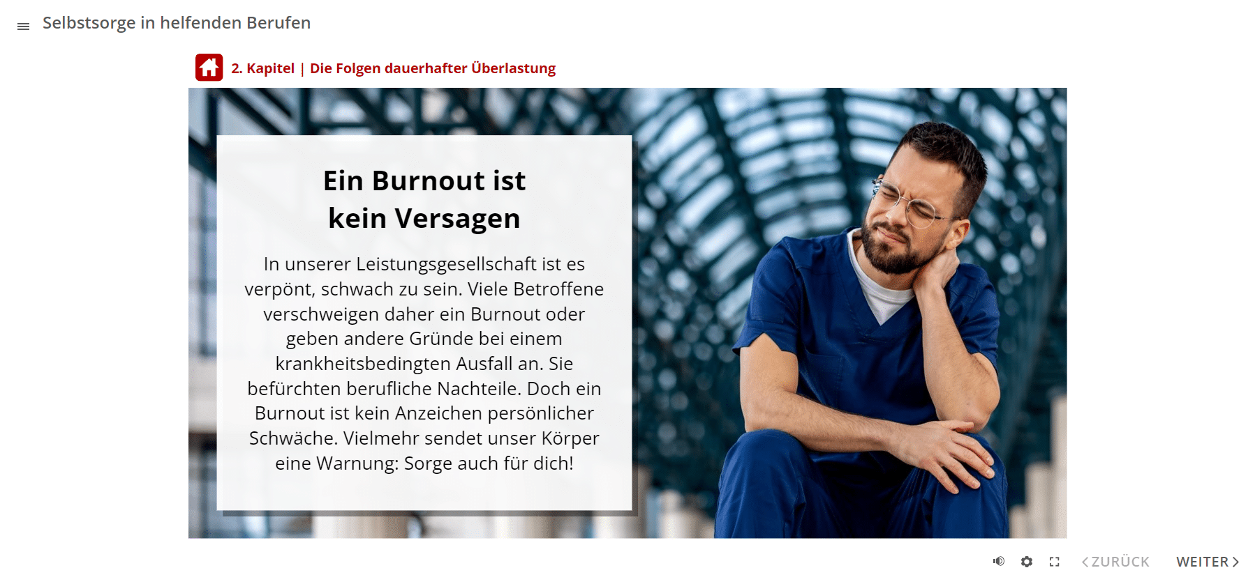 Das E-Learning-Modul gliedert sich in 4 Themenbereiche. Sie erfahren zunächst, welche Belastungsfaktoren es in Gesundheitsberufen gibt. Anschließend lernen Sie die Folgen dauerhafter Überlastungen kennen. Das Online-Training vermittelt zudem, wie Angestellte und Führungspersonen trotz Belastungen gesund bleiben können. Dies beinhaltet auch Aspekte der Suchtprävention. Im letzten Abschnitt geht es um die Frage, mit welchen Verhaltensweisen Sie den täglichen Belastungen als Team begegnen können.